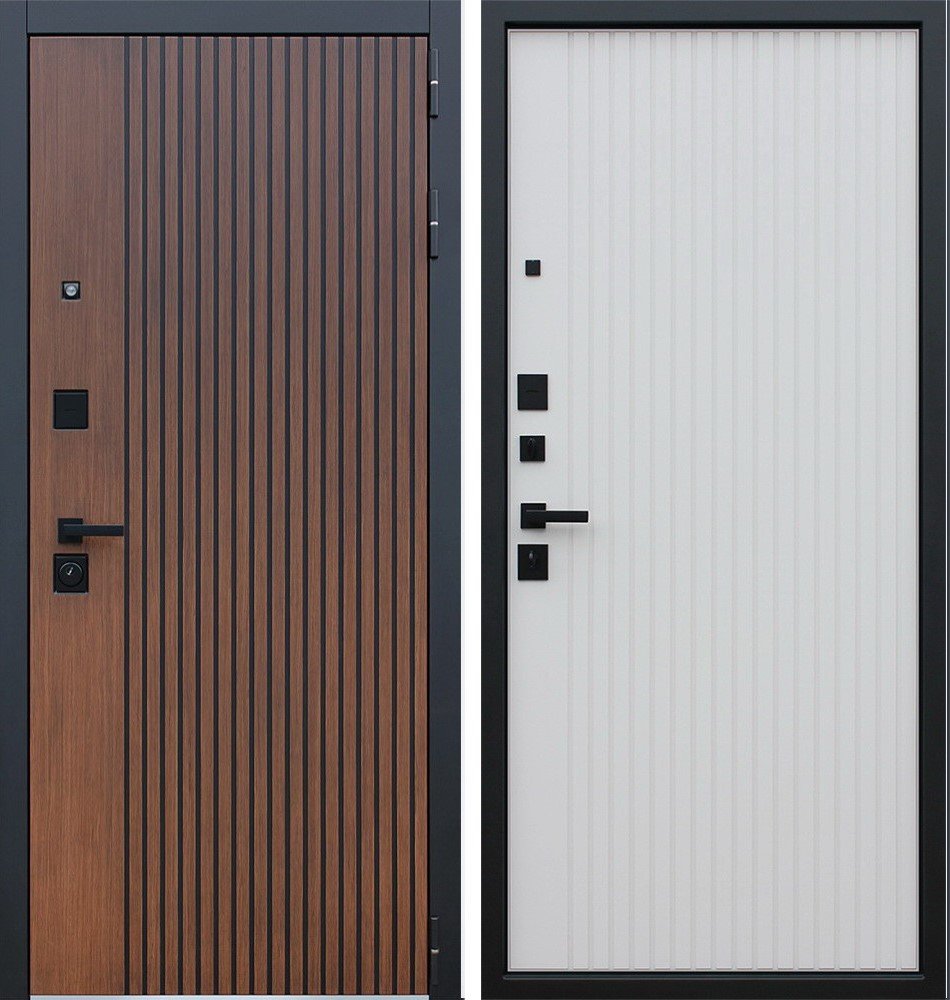 Порошковое покрытие "Муар черный". Экошпонированная дизайнерская панель МДФ 10 мм. Линейная фрезеровка. Цветовая комбинация: "дуб кантри темный", черное патинирование по фрезеровке. Наличник МДФ гладкий 80 мм., цвет "черный кварц".